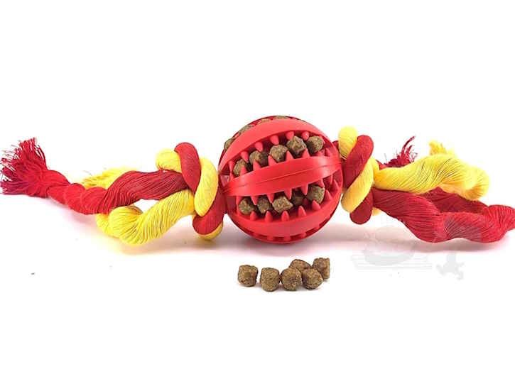 A 7 cm-es golyó „fogakra emlékeztető” kialakítása tökéletes a kutyák kedvenc finomságával való megtöltéshez, és ahogy a kutya gurítja a golyót, a finomságok végül elszabadulnak, és kellemes meglepetést okoznak a kutyának!